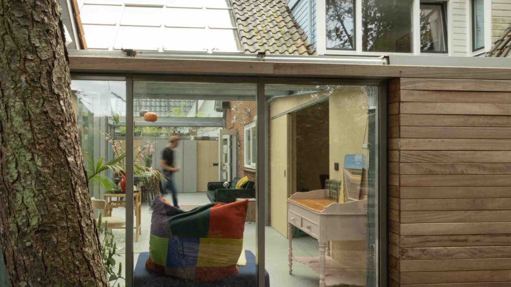 Door de hoogte van de kas kijk je vanaf de slaapkamers op de verdieping zo de kas in.